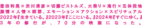 豊田利晃の人生の修行。その修行の映画というか映画の修行は、火の粉をかぶったり、階段を全力で駆けあがったり、冷たい滝にうたれたり、地面を這いつくばったり、足を踏みはずしたら死んでしまうようなとこにいたり。やる前は意気揚々とした心持ちで、「豊田の世界で暴れてやる!」なんて想像するが、いざ現場に入るとつらく大変な事が多く、早く終えて酒でも飲んでゆっくりしたいなんて思ったりもするが、まだこの修行のようなことをやりたいと想う自分もいるし、いつまでやるのかと想う自分もいる。ただ、ひとついえるのは、豊田さんとの人生の旅のような祭りのようなものは続けていきたいし続けていく。そしていずれは横に寝そべっている物語『横になる。』でしめる。